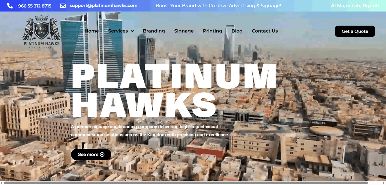 Developed a full-service branding and advertising agency website featuring signage solutions, large-format printing, CNC fabrication, outdoor advertising systems, and exhibition branding — with a bold, corporate identity.